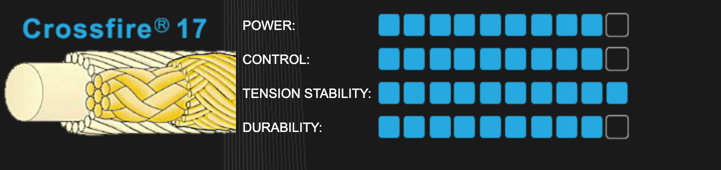 The Ashaway Crossfire 17 Tennis String has powerful, braided and bonded Aramid mains and Synthetic Gut crosses. The Crossfire family of tennis strings features a tough, durable braided Aramid main string combined with a Synthetic Gut cross string. This Hybrid stringing offers the playability of Synthetic Gut and the durability of Kevlar. The Crossfire 17 is slightly finer gauge string than CrossFire II for those who want a little more control.