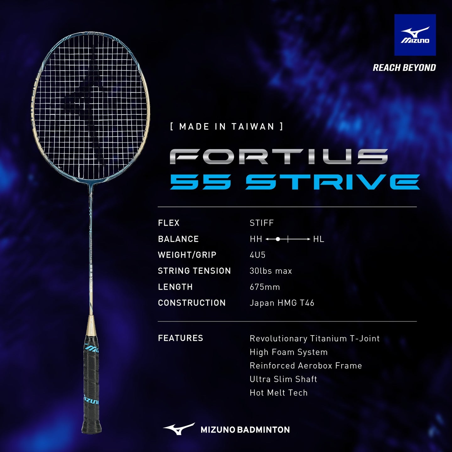 Unlock your full potential with the Made in Taiwan Fortius 55 Strive - the badminton racket engineered for pure speed and force!
