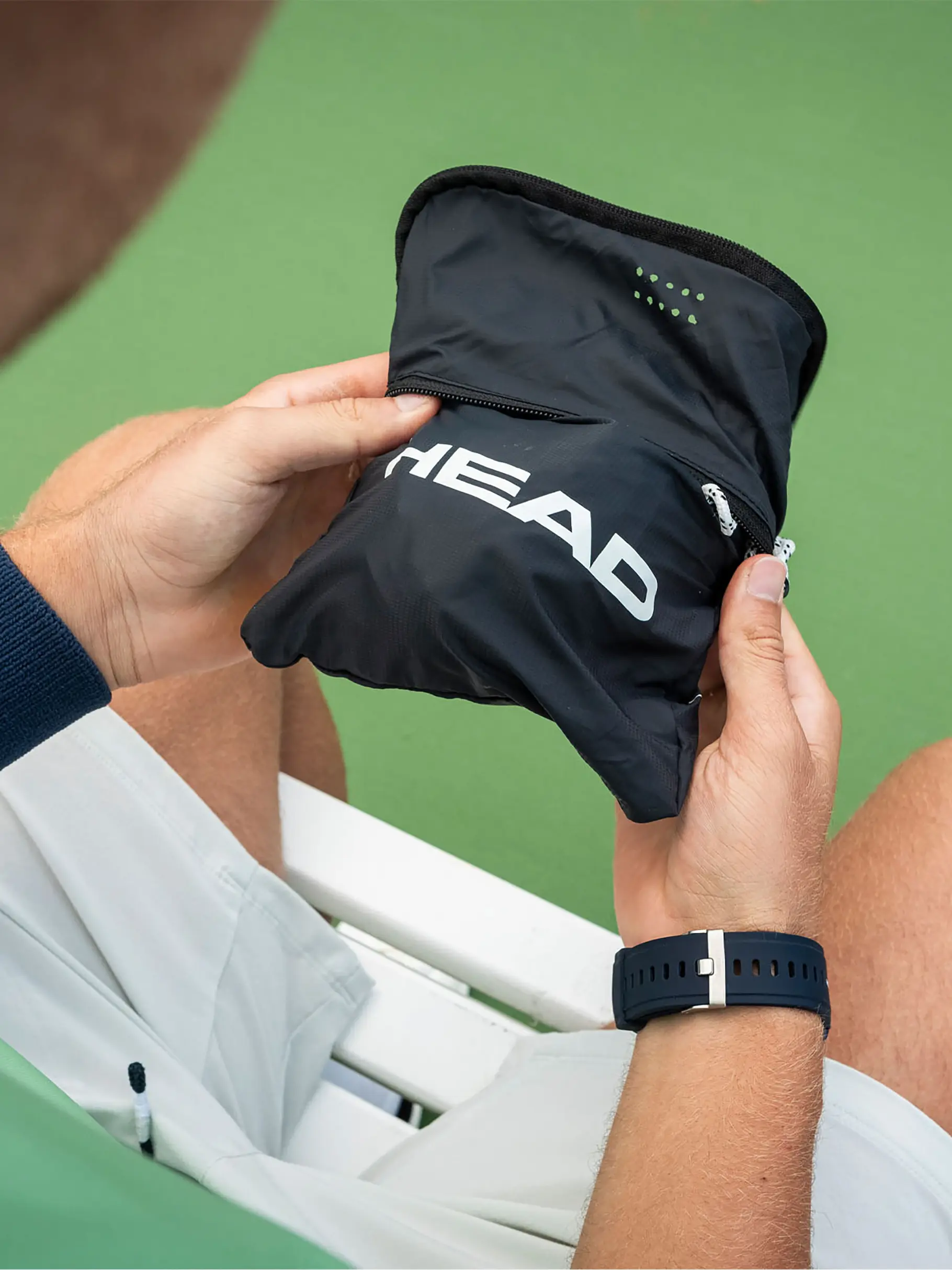 After a match or practice session, many tour players use the TOUR SHOE BAG BKWH to keep their dirty footwear ventilated and separate from the rest of their kit. Now offered with a new and contemporary design, and made with recycled PET fabrics, the shoe bag has a modern shape that matches the rest of HEAD's TOUR range. The packable TOUR SHOE BAG BKWH has a main compartment for one pair of shoes, as well as an accessory zipper pocket. In addition to choosing recycled PET fabrics for the shoe bag, HEAD has tried to reduce plastic usage with a hangtag made from recycled paper and tied with hemp cord, and the bag is presented in a new recycled plastic bag.