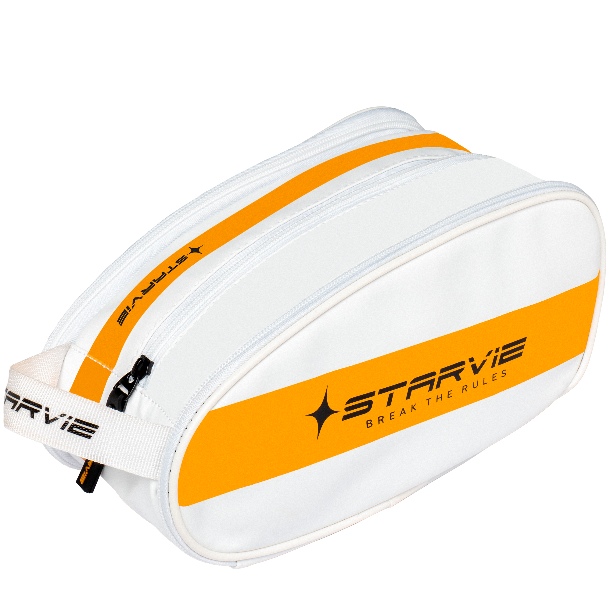 The StarVie Skyline Washbag 2026 is a compact toiletry organiser designed to keep your personal care items neatly stored. This washbag (not a racquet bag) features a sporty white design with golden stripe and black details. It includes a large central compartment for toiletries and two side pockets to help organise smaller items like razors, toothbrush, or travel-sized products.