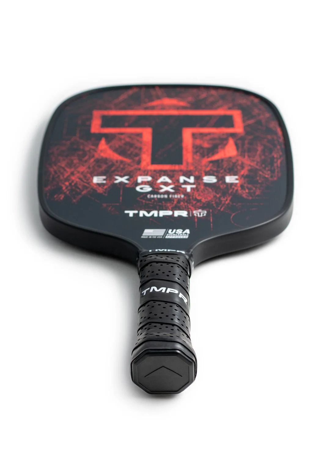 This paddle has a 5" handle length, and comes standard with a 4.25" circumference that is octagonally-shaped. The Expanse GXT is TMPR's version of a wide-body paddle, with slightly rounded sides to increase both playing area and performance. Features TMPR vibration dampening technology.