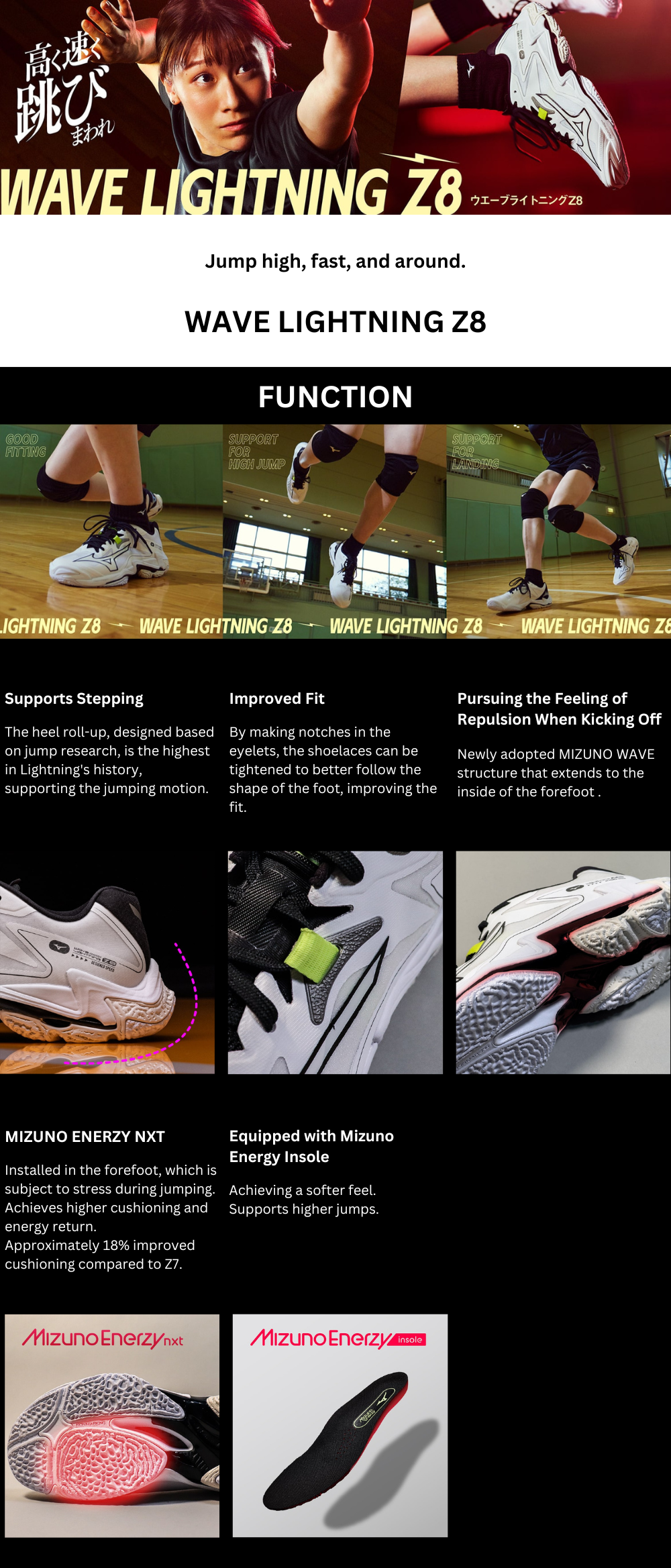 - The MIZUNO ENERZY NXT and MIZUNO ENERZY SOCKLINER equipped at the forefoot provide soft cushioning and high energy return that you can feel.